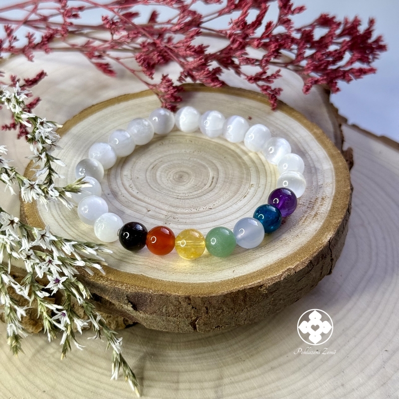 S láskou vyrobený čakrový náramek z drahých kamenů granátu, karneolu, citrínu, avanturínu, chalcedonu, apatitu, ametystu, selenitu a křišťálu působí na našich sedm základních čaker. Energií v čakrách získáme zdraví, sílu a lehkost v životě.