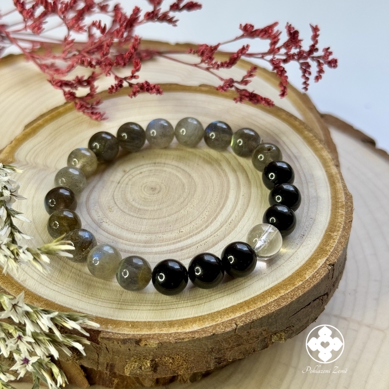 S láskou vyrobený minerální náramek z drahých kamenů křišťálu, turmalínu a labradoritu vám pomůže posílit víru v sebe sama,odstranit napětí, stres a přinese sílu a vytrvalost.