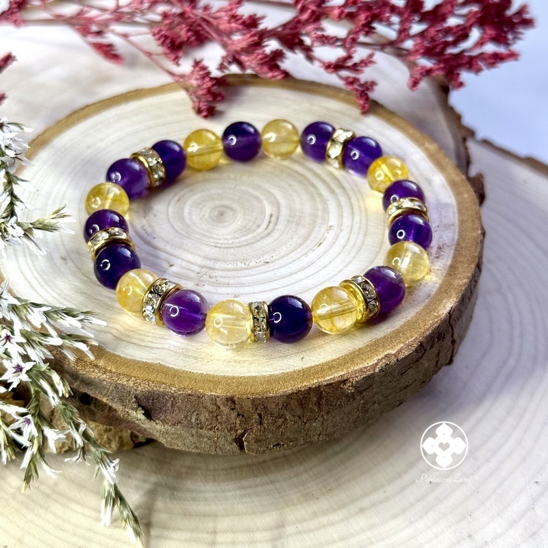 S láskou vyrobený minerální náramek z drahých kamenů ametystu a citrínu doplněný šatonovými rondelkami vám pomůže rozvíjet pozitivní postoje a pohlížet optimisticky do budoucnosti.