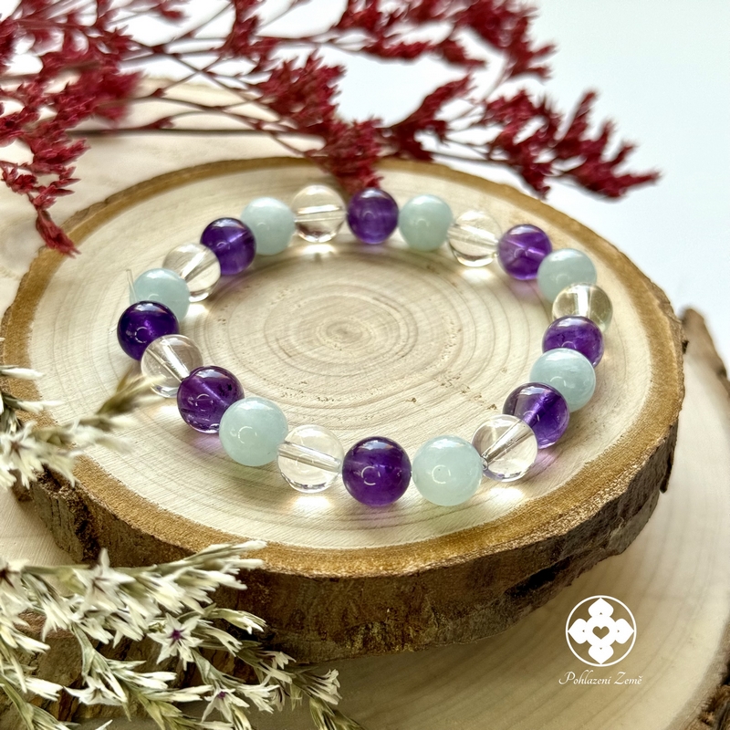 Minerální náramek z akvamarínu, ametystu a křišťálu vám přinese odvahu a klid.