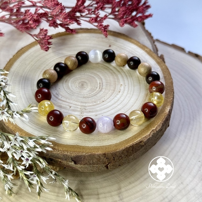 S láskou vyrobený minerální náramek z drahých kamenů jaspisu, citrínu, kunzitu, selenitu a vzácných dřevin santoského palisadru a kafrového dřeva.