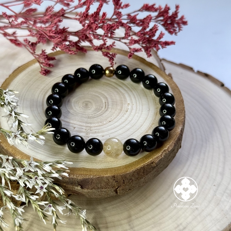 S láskou vyrobený náramek z minerálních korálků sagenitu a turmalínu vám pomůže realizovat cíle.