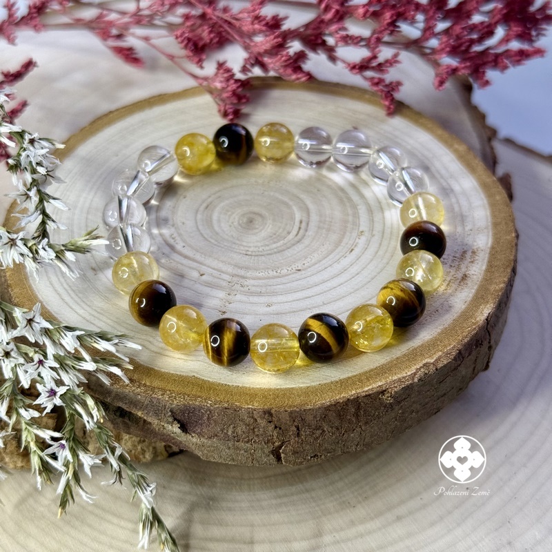 S láskou vyrobený minerální náramek z drahých kamenů křišťálu, citrínu a tygřího oka vám pomůže při dosahování cílů, uznání vlastní ceny, přehnanou sebekritikou a zablokovanými tvůrčími schopnostmi.