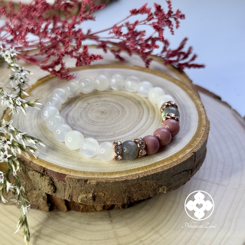 S láskou vyrobený náramek z minerálních korálků rodonitu a labradoritu vám pomůže s udržením citové rovnováhy v životě.