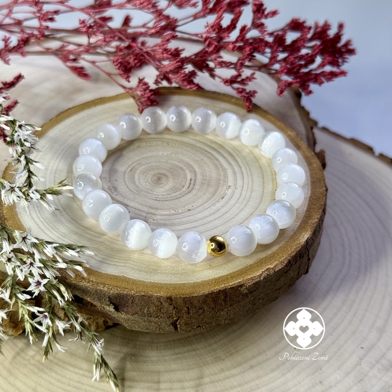 Selenitový náramek vám pomůže udržet čistou mysl, najít vnitřní klid a emočnístabilitu. Ukáže vám, že máte v sobě jedinečnou jiskru , spektrum silného, jasného světla a uvede vás do souladu se svou duší.